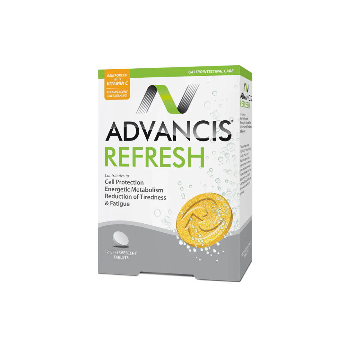 Advancis Refresh is a detoxifying effervescent supplement formulated with silymarin, caffeine, and essential vitamins to support liver health and recovery after alcohol, food, or smoking excess. It revitalizes the body, aids digestion, and helps reduce fatigue.