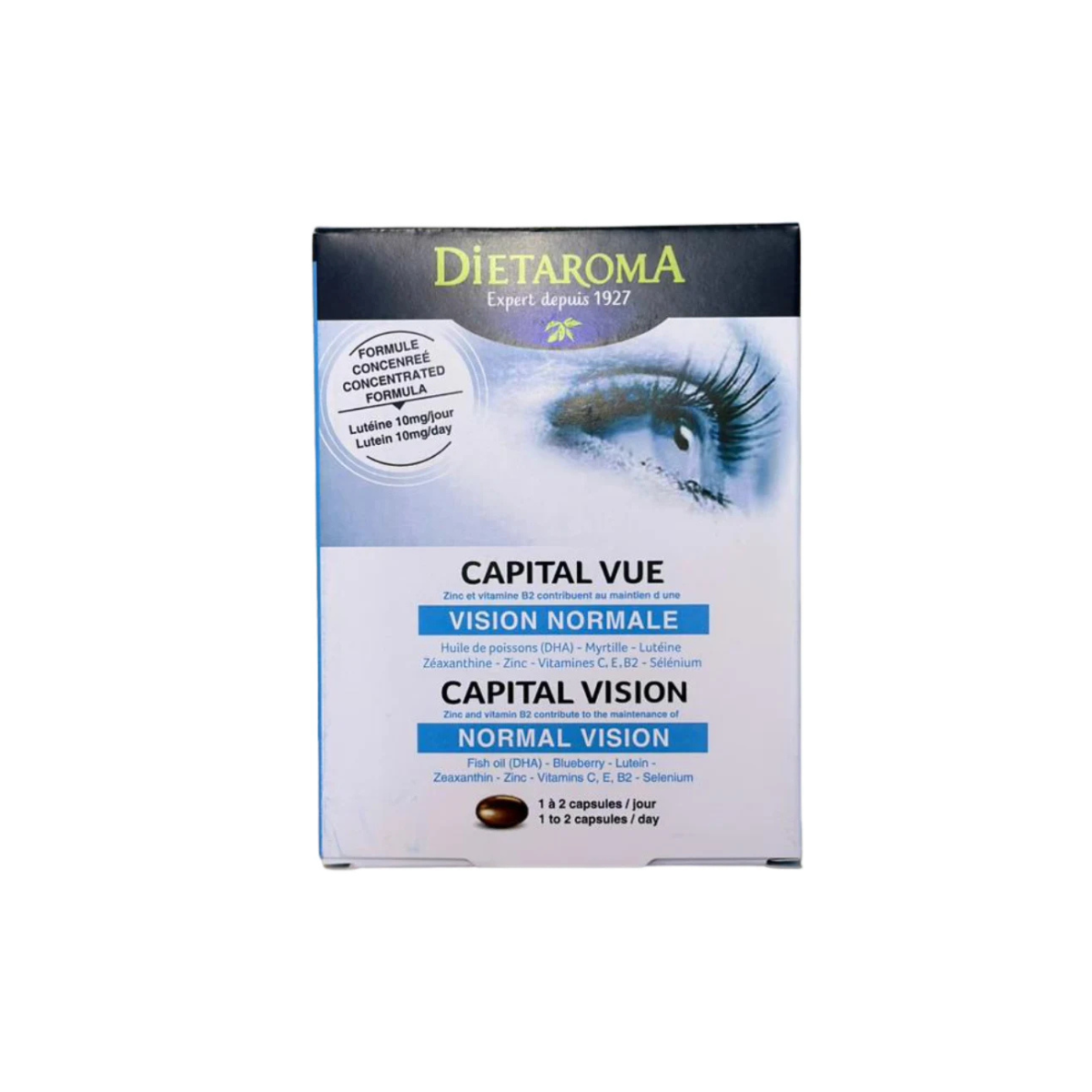 Capital Vue by Dietaroma is a concentrated vision support supplement with lutein, zinc, vitamin B2, and antioxidants to help maintain normal vision and reduce eye fatigue from screens, sunlight, and pollution. Take 1–2 capsules daily.