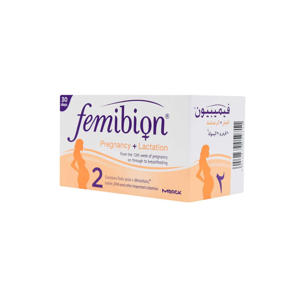 Femibion® 2 Pregnancy + Lactation is a prenatal and postnatal supplement designed for women from the 13th week of pregnancy through breastfeeding. It provides folic acid, Metafolin®, iodine, DHA, and essential vitamins to support maternal health and the normal brain and eye development of the baby.