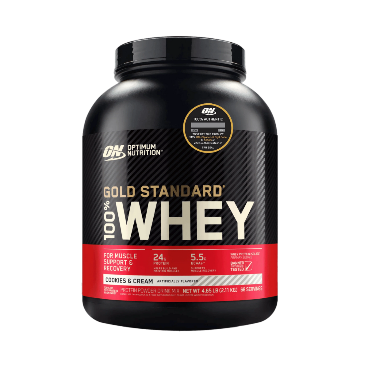 Gold Standard 100% Whey by Optimum Nutrition delivers 24g of premium protein per serving with 5.5g of BCAAs to support muscle growth, recovery, and performance. Featuring Whey Protein Isolate as the primary source and a delicious Cookies & Cream flavor, it’s the perfect post-workout shake or daily protein boost.