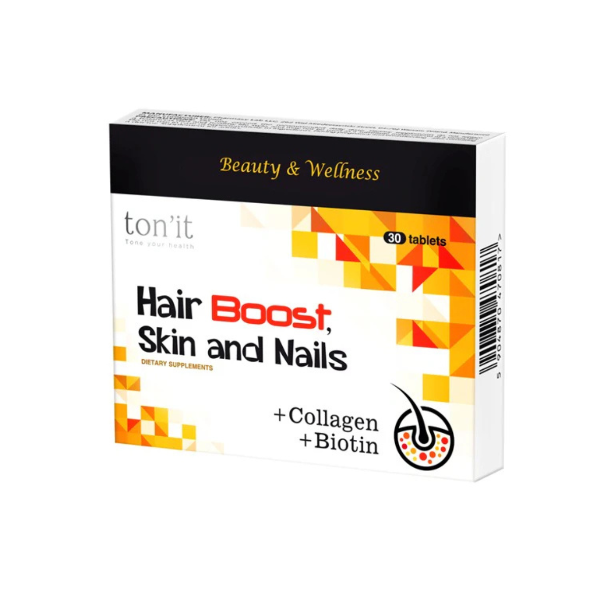 Hair Boost, Skin and Nails is a dietary supplement with collagen, L-cysteine, biotin, and essential vitamins that help maintain healthy hair, radiant skin, and strong nails while supporting collagen formation and protecting cells from oxidative stress.