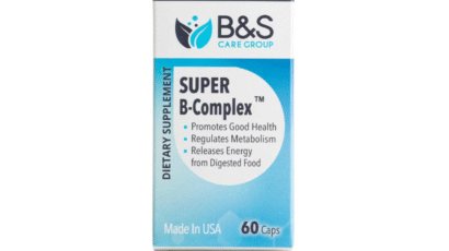 SUPER B-COMPLEX™ by B&S Care Group – A dietary supplement that supports overall health by regulating metabolism and helping the body release energy from food. Packed with essential B-vitamins, it promotes energy production, nervous system function, and wellbeing.
