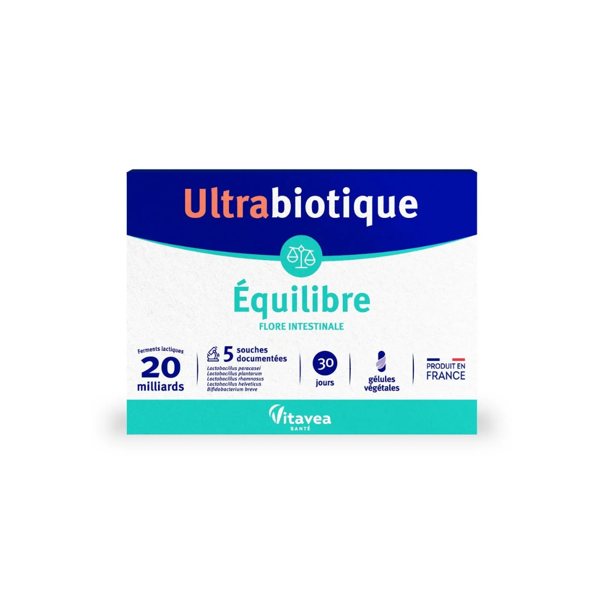 Ultrabiotique Équilibre provides 20 billion lactic ferments from 5 scientifically documented and gastro-resistant strains to support optimal intestinal flora and digestive health.